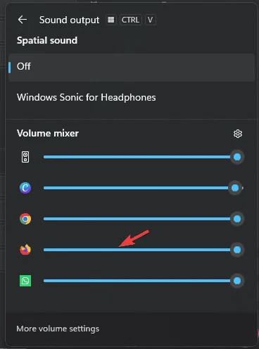 步驟 5:最後,單擊 Firefox 音量欄旁邊的下拉箭頭,並確保輸出設置為默認。