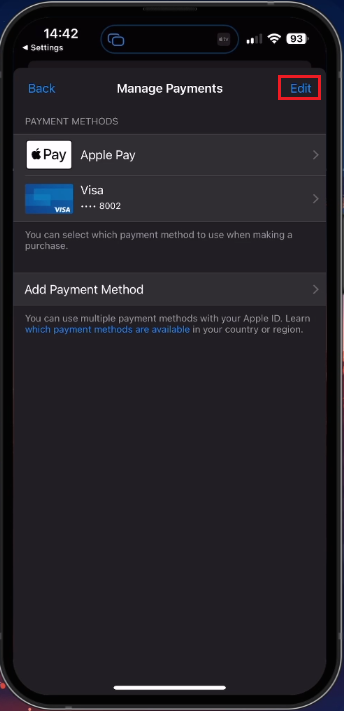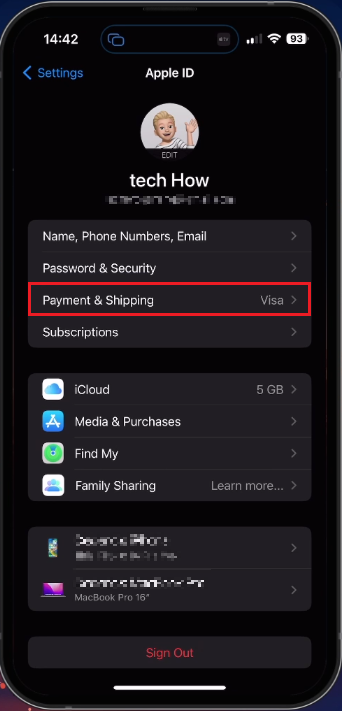 使用 iOS 設備時,打開設備設置並點擊您的 Apple ID。您可能需要使用新的 Apple ID 憑據登錄。在繼續之前,可能還會要求您接受許可協議。接下來,點擊付款及運輸,並驗證您的付款方式。