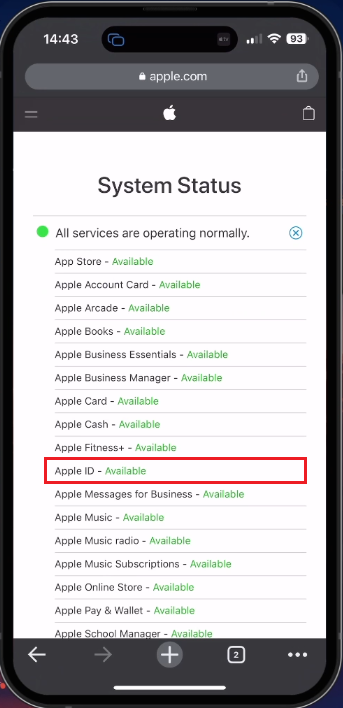 最後,確保 Apple ID 服務器已啟動並正在運行。導航至apple.com/support/systemstatus。確保 Apple ID 以及 iCloud 帳戶和登錄服務器可用且未處於維護狀態。