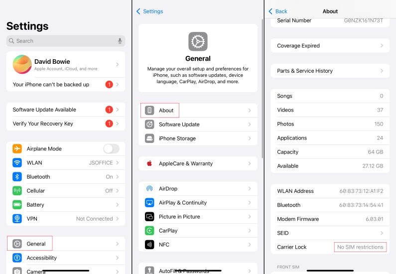 如果您的iPhone已鎖定到運營商,則只能將其與該載體一起使用。要查看運營商帳戶狀態,請轉到設置>一般>關於設置>一般>關於。如果您的iPhone已解鎖,則您會發現運營商鎖旁邊沒有SIM限制。