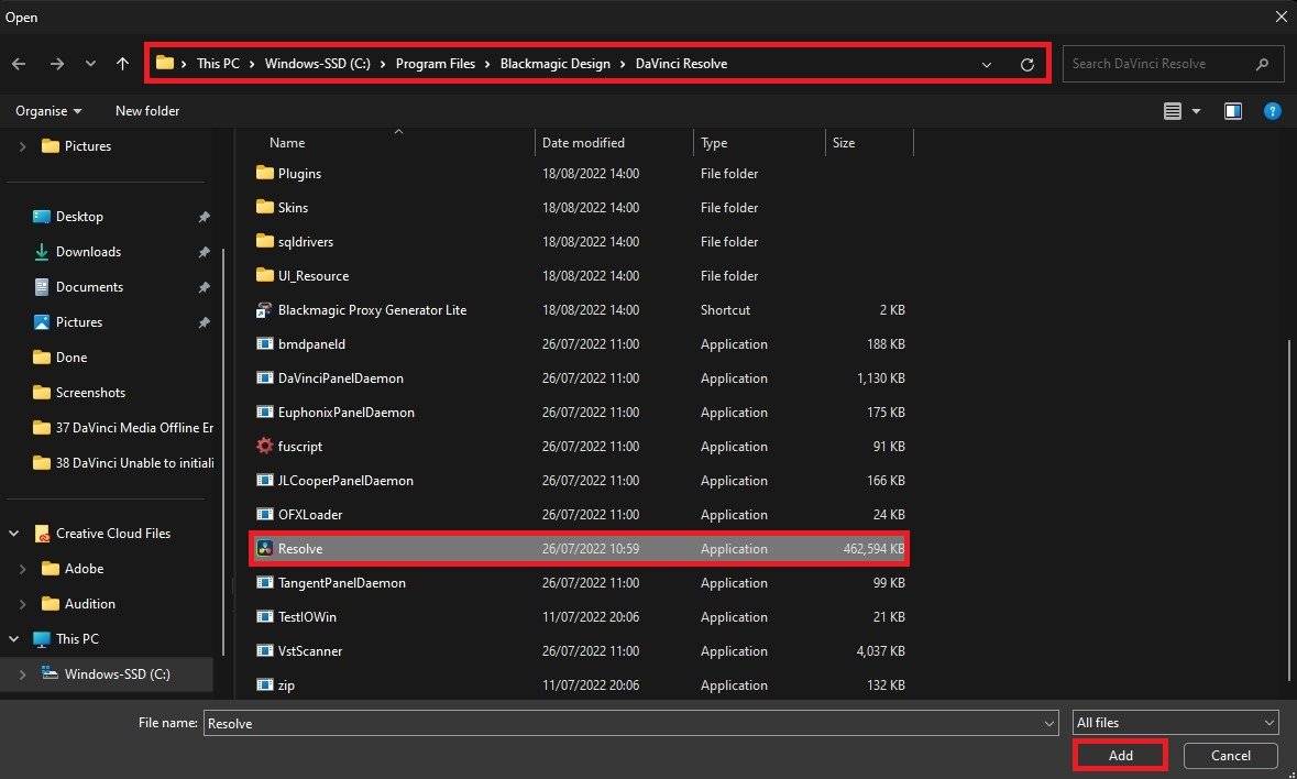 DaVinci Resolve 的默認安裝位置位於主驅動器下程序文件>黑魔法設計>達芬奇決心。向下滾動,直到找到解決程序應用。