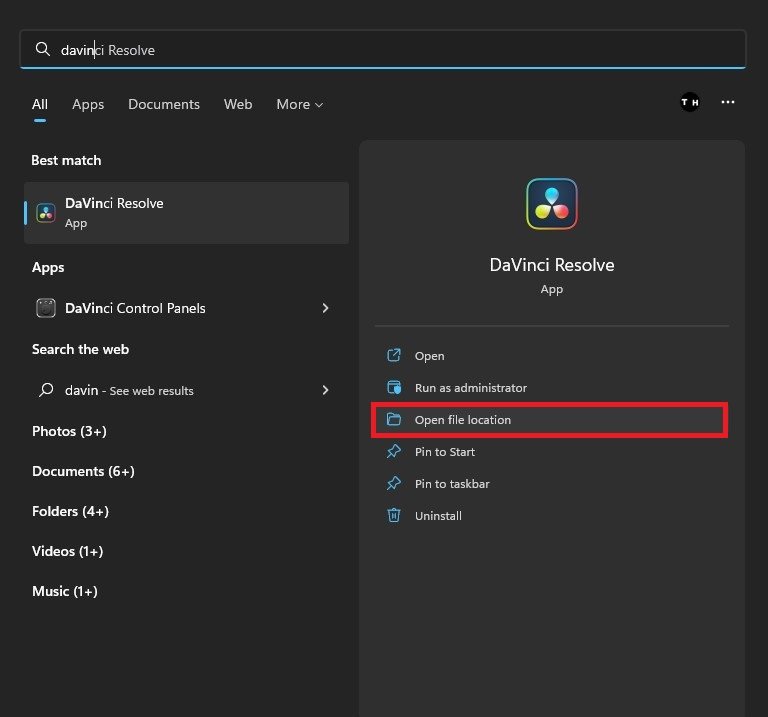 如果 DaVinci Resolve 未安裝在此位置,請搜索 DaVinci 並選擇打開文件位置對於該應用程序。在大多數情況下,這將是 DaVinci Resolve 快捷方式的位置。右鍵單擊快捷方式並選擇打開文件位置再次到達此應用程序的最終安裝位置。