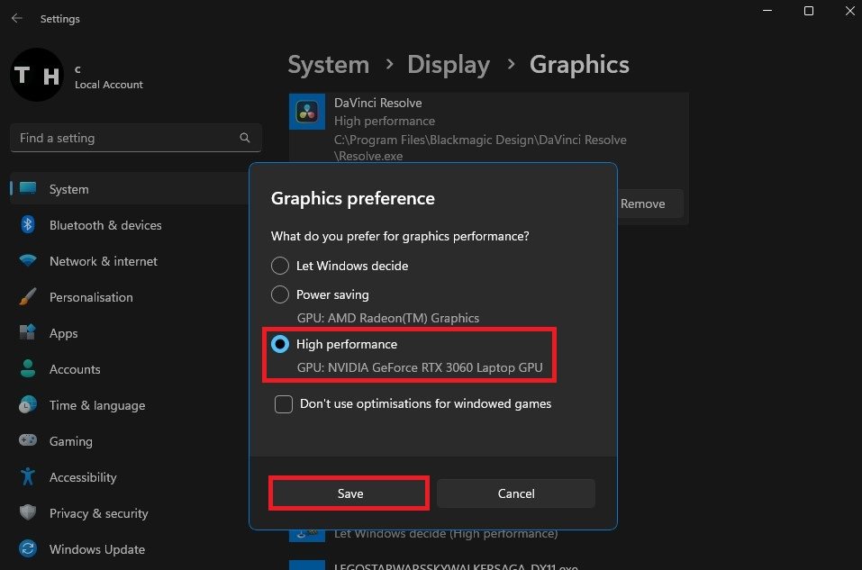 將應用程序添加到此列表後,單擊“選項”以更改其圖形偏好到高性能。這將允許 DaVinci Resolve 使用您的顯卡並修復您遇到的“無法初始化 GPU”錯誤。