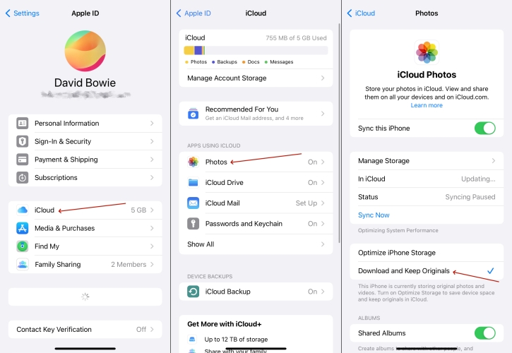 啟用存儲優化可以節省存儲空間,但隨之而來的是照片和視頻的質量下降,並且您將無法在 iPhone 上看到更清晰的圖像。因此,有必要在“設置”中關閉“優化 iPhone 存儲”選項,以解決 iPhone 上無法加載視頻和照片的問題。