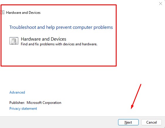 - 您應該能夠訪問硬件和設備疑難解答,然後單擊下一個。
