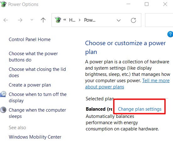 - 這將顯示您當前的電源計劃。繼續查找並單擊改變計劃設置根據首選計劃計算機屏幕右側的部分。