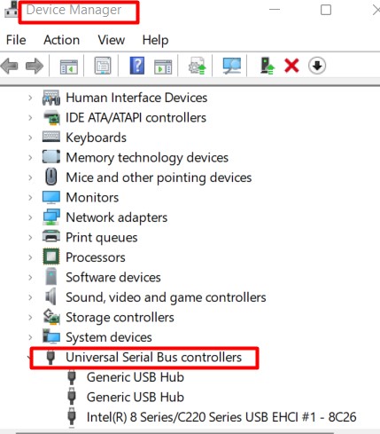 - 展開USB控制器選項並查看USB設備驅動程序。右鍵單擊它,然後更新驅動程序選項將被揭示。