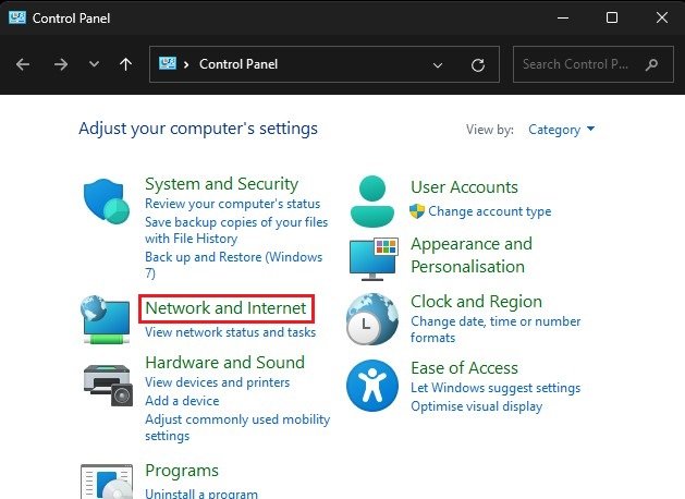 最後,您可能需要更改 DNS 服務器地址才能解決連接下載緩慢的問題。打開你的控制面板通過在開始菜單搜索中搜索它。確保查看方式:類別,然後單擊網絡和互聯網。