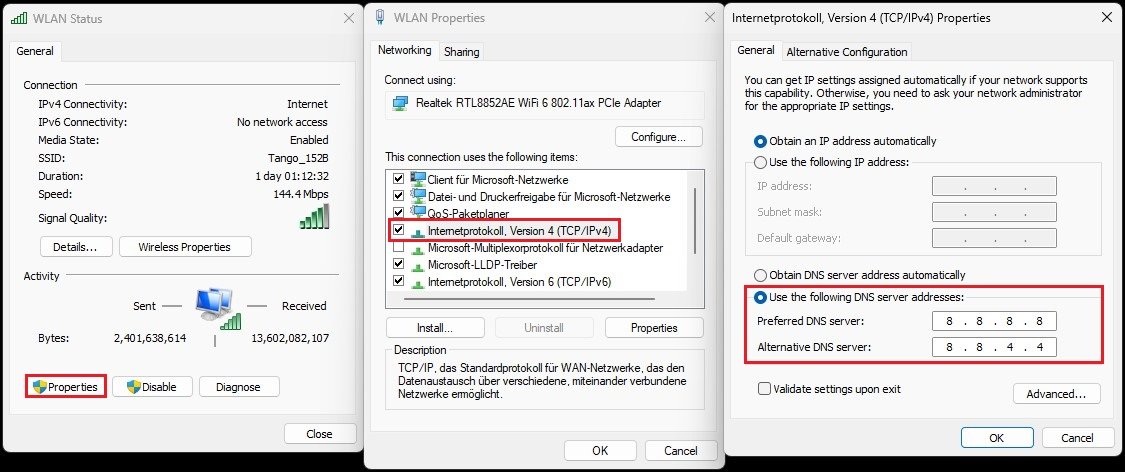 屬性 > Internetprotokoll,版本 4 > 使用以下 DNS 服務器地址