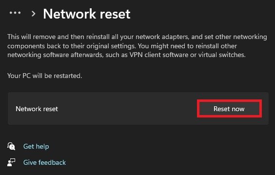 點擊網絡重置。這將允許您重置網絡設置並重新安裝網絡適配器。如果您使用自定義 DNS 服務器,則必須重新安裝 VPN 客戶端並更改 DNS 服務器地址。