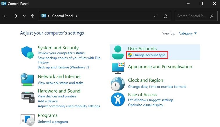如果您使用標準 Windows 帳戶,請打開您的控制面板。查看您的設置按類別並點擊更改賬戶類型。