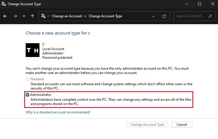 選擇您的帳戶,然後更改賬戶類型。這將允許您使用具有管理員權限的帳戶來控制您的電腦並允許更改您的網絡設置。如果您使用的是工作或學校計算機,則必須向管理員請求訪問權限才能更改您的 WiFi 或其他網絡設置。您必須重新啟動電腦才能使更改生效。