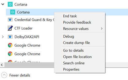 過程。 - 步驟 6:最後,右鍵單擊“Cortana”,然後選擇“結束”