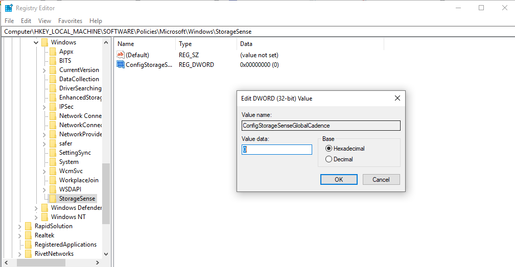 - 轉到註冊表項 –HKEY_LOCAL_MACHINESOFTWAREPoliciesMicrosoftWindowsStorageSense