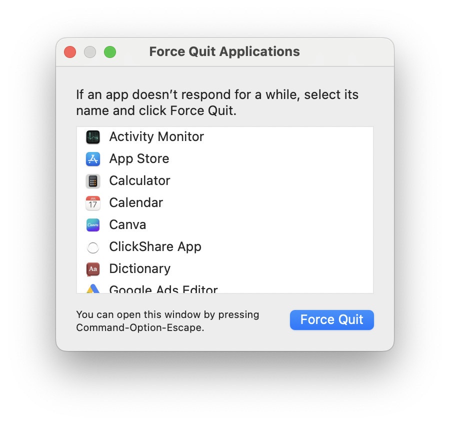將出現一個窗口,顯示所有打開的應用程序。選擇無響應的應用程序並單擊強制退出。