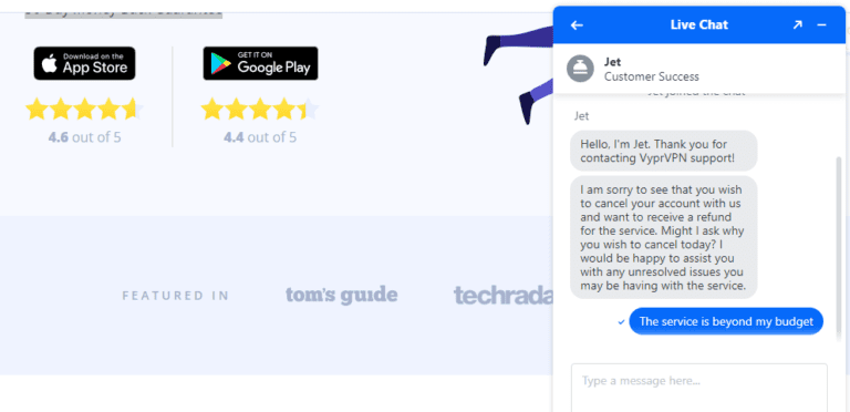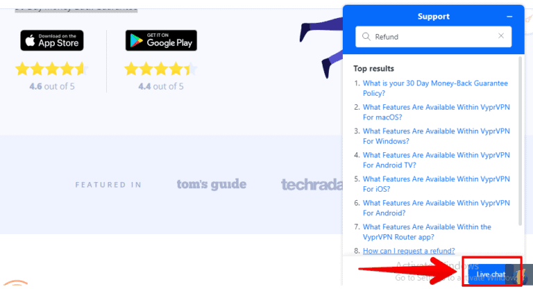 您只能通過實時聊天請求退款,幸運的是,該實時聊天全天候 24/7 運行。