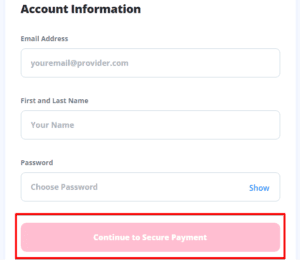 - 填寫您的電子郵件地址、名字和姓氏,然後選擇密碼。然後,單擊“繼續安全支付”。