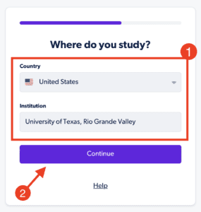 - 選擇您所在的國家/地區和您就讀的機構,然後單擊“繼續”。
