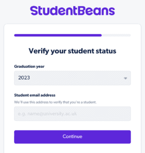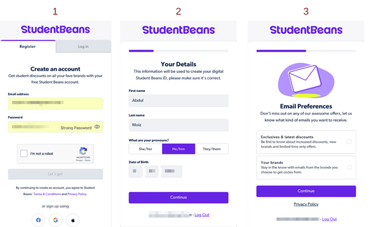 - 輸入您的電子郵件和密碼來創建 Student Beans 帳戶。然後,輸入您的詳細信息(姓名、出生日期、代詞),並設置您的電子郵件首選項。