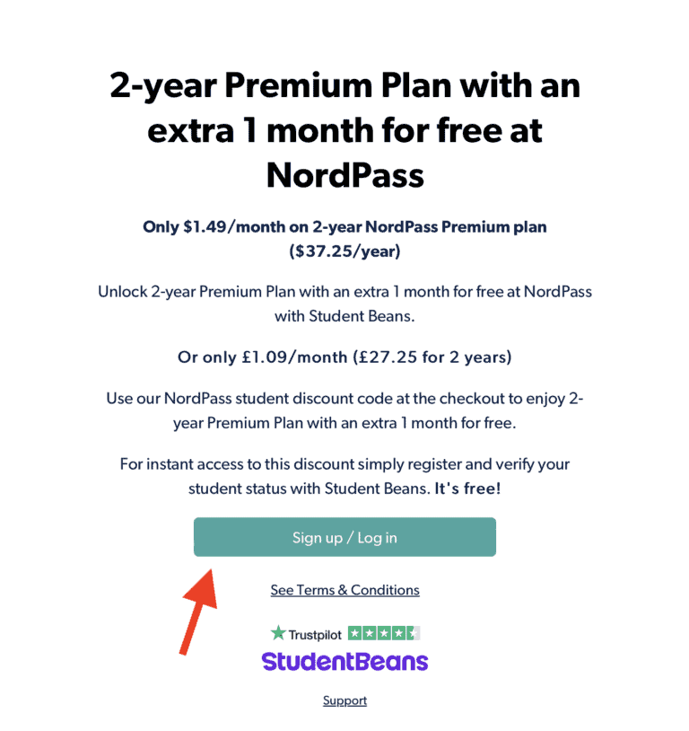 您可以從其官方網站獲得 NordPass 學生折扣,以節省更多,並免費獲得額外一個月的訂閱。您需要接受資格檢查,然後您將獲得學生折扣代碼以享受節省。