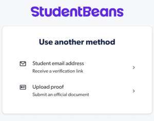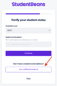 - 輸入您的學生電子郵件地址以接收鏈接或上傳證明文件,例如身份證,然後單擊“繼續”。我會選擇“上傳證明”對於這次演示。