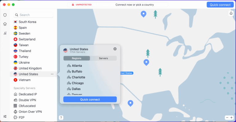 - 選擇美國使用NordVPN 的交互式地圖。幾分鐘後,應該會說“受保護”在頂部。這意味著您的 VPN 會話現已激活。剩下的就是使用權NBA 聯盟通行證使用你最喜歡的網頁瀏覽器。