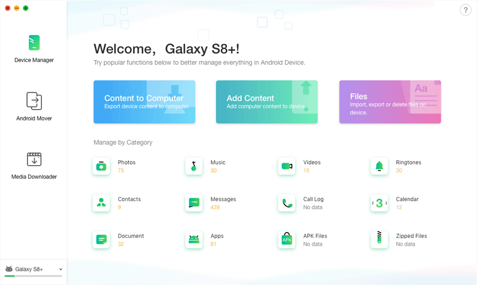 - 支持管理音樂、照片、視頻、聯繫人、消息、通話記錄、應用程序等。
