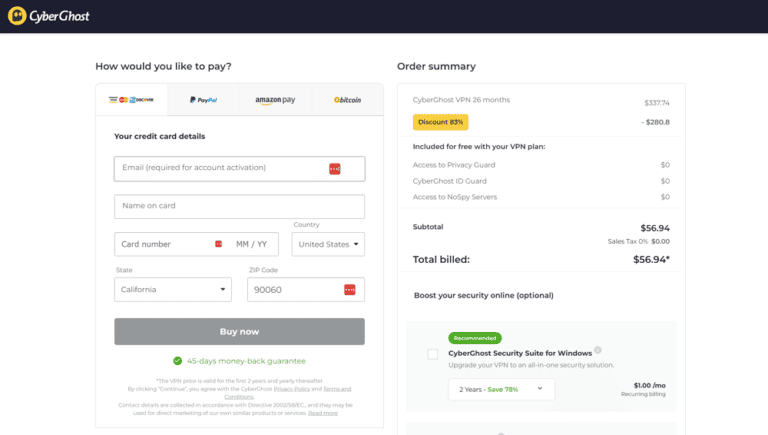 您可以使用信用卡、PayPal、Amazon Pay 和比特幣支付 2 年 CyberGhost 計劃。但為了在付款過程中獲得最大的節省,請使用我們的特別優惠鏈接。