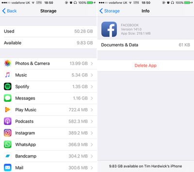 您可以通過用手指按住應用程序並點擊其圖標角上的 X 來刪除應用程序。或者,轉到“設置”->“通用”->“存儲和 iCloud 使用情況”->“管理存儲”,點擊任何不使用的應用程序,然後選擇“刪除應用程序”。狠一點——如果您改變主意,您可以隨時重新安裝已刪除的應用程序。