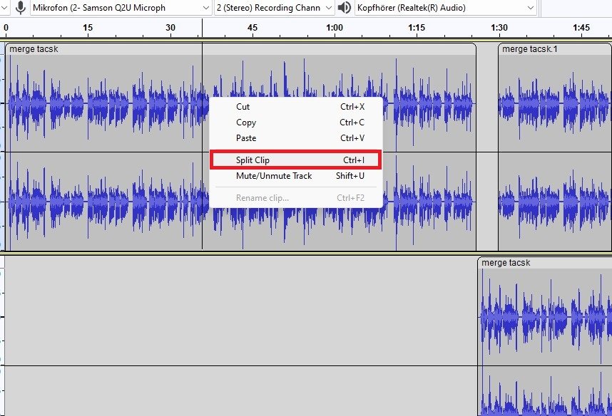 您可以在此時間軸中移動軌道,如果您希望將軌道插入到特定點,請確保右鍵單擊要插入音頻的軌道並選擇分割剪輯。這會將音軌分成兩部分,您可以在其中粘貼之前複製的音軌。