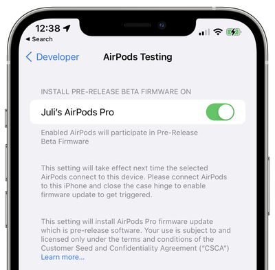 Apple 於 2021 年 7 月開始提供 AirPods Pro 的測試版固件,該軟件可供 Apple Developer 計劃成員使用。
