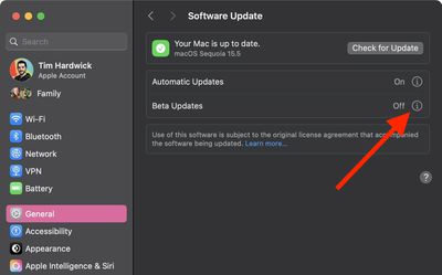 - 查找“Beta 更新”並單擊其旁邊的信息 (i) 符號。