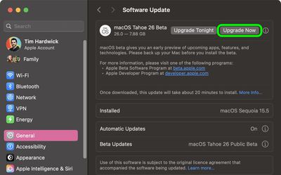 這就是您需要做的全部。安裝過程將像標準 macOS 更新一樣完成,因此請坐下來讓安裝完成,之後您的 Mac 將直接啟動進入 macOS Tahoe Beta。