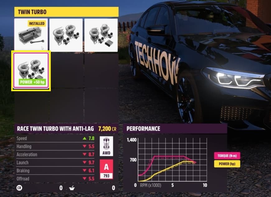在此關鍵步驟中,您的重點應該是選擇明顯標記為“帶防滯後”的渦輪增壓器。這種特殊的修改可以防止齒輪轉換過程中出現滯後,從而使您在賽車比賽中獲得巨大的優勢。例如,當參加與熟練玩家的高風險比賽時,此功能可能是您確保勝利的秘密武器。