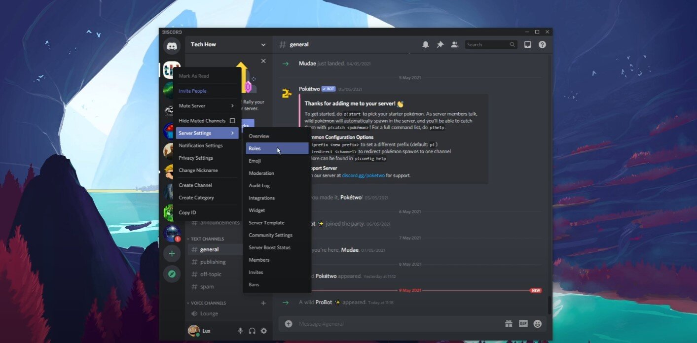 完成後,單擊邀請。系統會詢問您希望將機器人添加到哪個服務器。選擇正確的服務器;一兩秒後將打開一個新窗口。您必須允許機器人執行所有操作權限才能正常工作。選擇後授權,您應該看到 ProBot 是您的 Discord 服務器的成員。您應該確保機器人具有在您的服務器上運行的適當角色。導航到您的服務器設置並選擇角色。