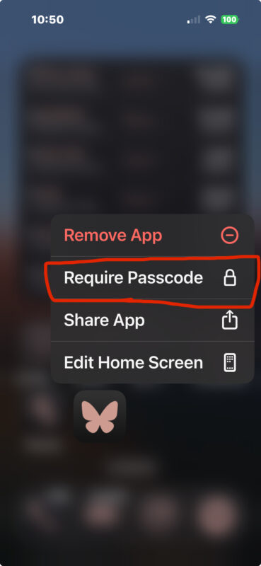 - 長按並按住您要鎖定的應用程序,直到您看到出現彈出菜單,然後點擊“需要面對ID”或“需要密碼”,具體取決於您的設備安全設置