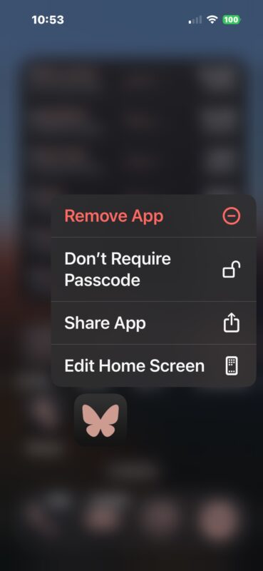 刪除應用程序鎖與啟用應用程序鎖一樣容易。只需點擊並按住鎖定的應用程序,然後從彈出式上下文菜單中選擇“不需要面部ID”或“不需要密碼”,具體取決於您的特定設備安全設置。