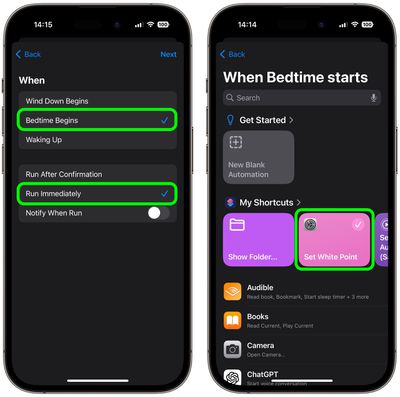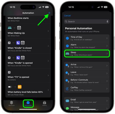 為了確保早上就寢時間結束時重置 iPhone 顯示屏上的白點,您只需創建一個額外的自動化。這基本上涉及您剛剛用於創建第一個自定義自動化的相同步驟,只不過不是在步驟 3 中選擇就寢時間開始,而是選擇醒來。為了您的方便,這裡再次列出這些步驟,但對步驟 3 進行了修改。