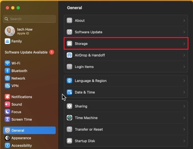 有多種方法可以釋放 Mac 上的存儲空間,我建議您查看一下存儲設置第一的。打開你的系統設置。對於 macOS Ventura 及更高版本的用戶,請導航至一般的部分並單擊貯存。