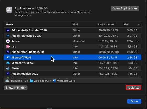 接下來,單擊您旁邊的“i”圖標應用領域。您可以按大小或上次打開該列表的日期對該列表進行排序。選擇您不再使用或不需要的應用程序,然後選擇刪除。這將卸載應用程序,但某些本地用戶文件可能會保留在您的存儲中。
