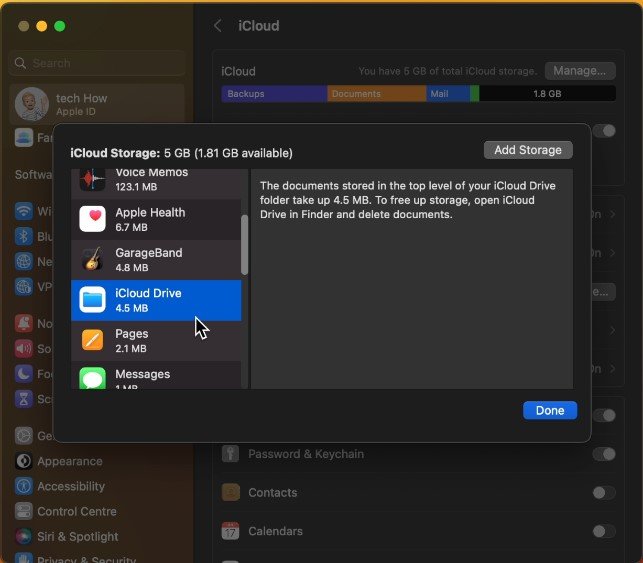 如果您不確定 iCloud 存儲的使用情況和設置,請單擊您的蘋果ID在此窗口左上角的名稱並選擇iCloud。