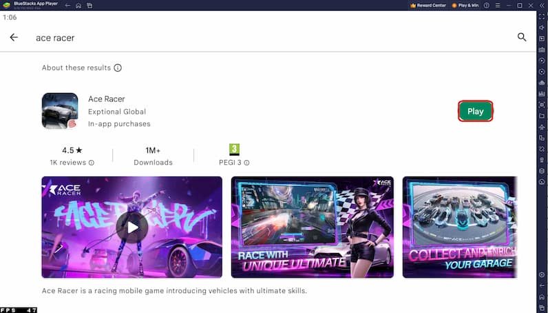 打開您的 Play 商店並使用您的 Google 帳戶登錄。搜索 Ace Racer 並將游戲下載到您的 BlueStacks 模擬器。這可能需要幾分鐘才能完成,具體取決於您的網絡連接。