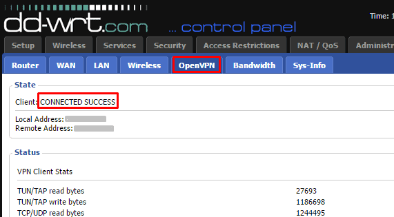 - 瞧!您已使用 NordVPN 配置 DD-WRT 路由器。要確認 VPN 是否正常工作,請轉至地位>開放VPN並檢查是否“狀態”是“客戶:連接成功。 ”