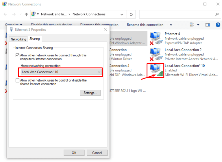 - 選擇分享選項卡並選中“允許其他網絡用戶通過此計算機的 Internet 連接進行連接”。