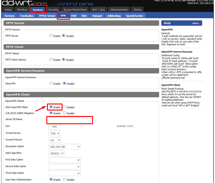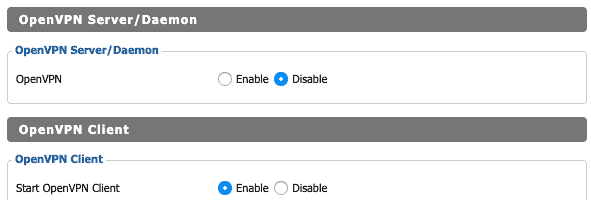 - 前往服務>VPN和禁用 PPTP 服務器、PPTP 客戶端, 和OpenVPN 服務器/守護進程。接下來,在OpenVPN客戶端, 放啟動 OpenVPN 客戶端到使能夠。