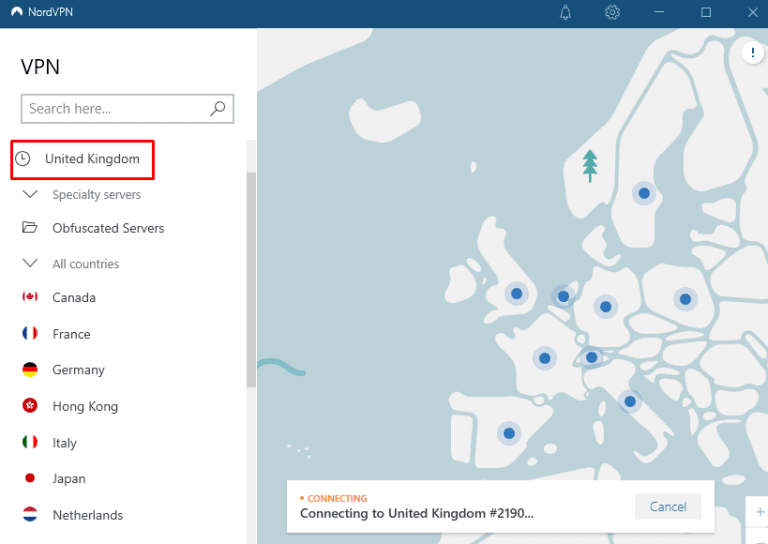請記住,NordVPN Windows 應用程序不允許您選擇特定服務器。要移動到同一位置的不同 VPN 服務器,請斷開連接並再次重新連接到該服務器位置。