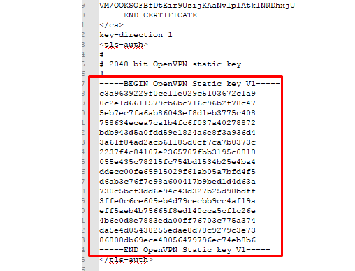 - 重新打開配置文件並滾動到<tls-auth>。複製 TLS 密鑰的內容,包括“——開始 OpenVPN 靜態密鑰 V1 …“ 到 ”…結束 OpenVPN 靜態密鑰 V1—–”。