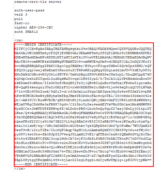- 還記得您之前下載的 .ovpn 配置文件嗎?在文本編輯器中打開它並將內容複製到<ca>和</ca>標籤(請勿複制<ca>和</ca>標籤)。