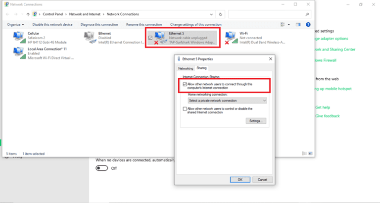 - 選中“”旁邊的框允許其他網絡用戶通過此計算機的 Internet 連接進行連接” 在“分享” 選項卡。