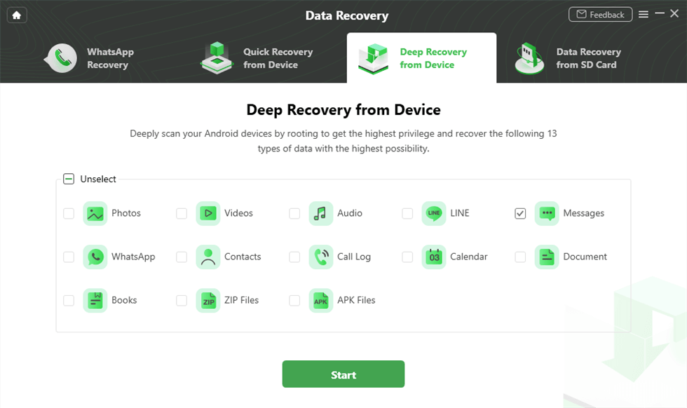 通常,您可以恢復出廠設置後通過Google備份恢復消息。但是,如果您沒有提前備份,DroidKit – Android Phone Toolkit 將是最好的 Android 手機短信救援程序! DroidKit Android數據恢復配備了深度恢復工具。它可以深度掃描您的 Android 手機,並允許您預覽所有手機數據,然後選擇在沒有備份的情況下恢復消息。